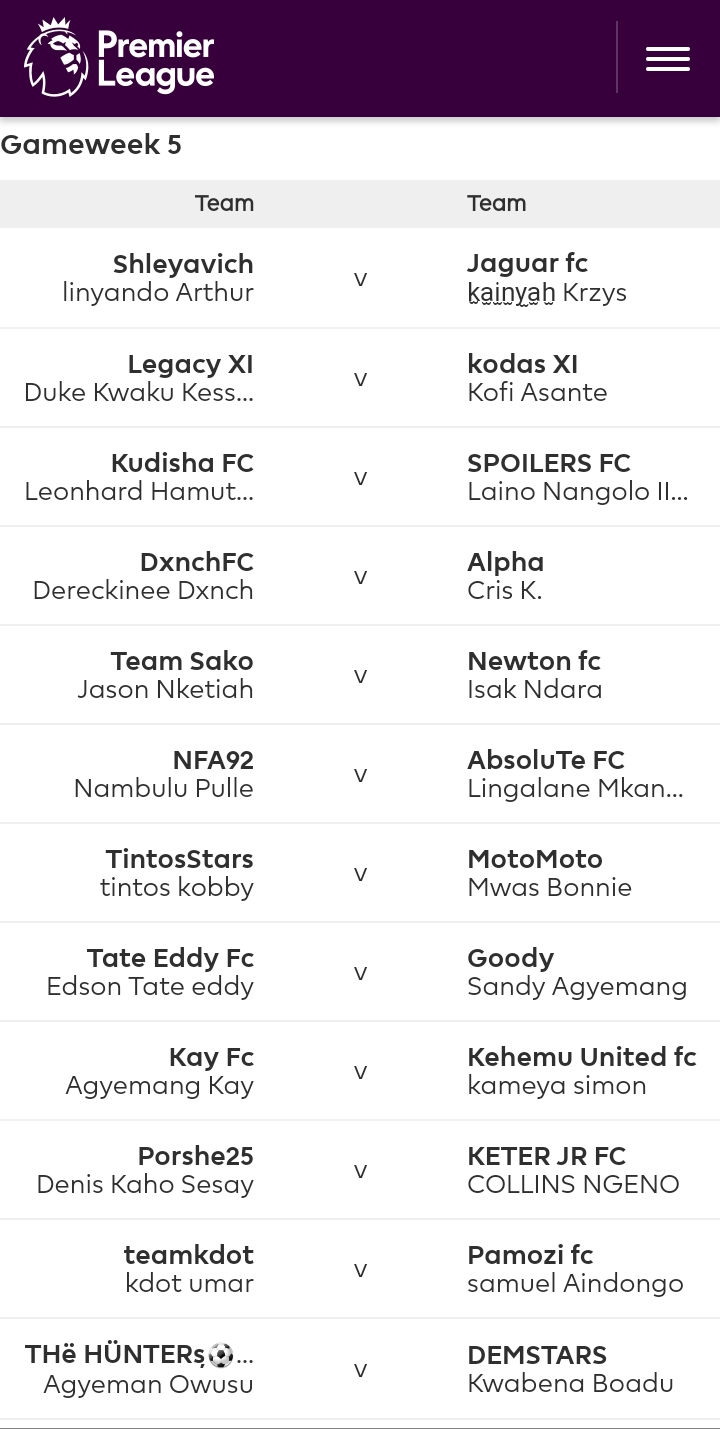 In Gw5 we kick the Exclusive 🔥🔥🔥🔥with a big one Shleyavich fc take on defeding champs Jaguar fc while in form Pamozi 🇳🇦🇳🇦🔥🔥🔥🔥 travel to out of form TeamkDot another team Team Sako to be exact will be looking to stop the rise of the Newton fc..can they do it?